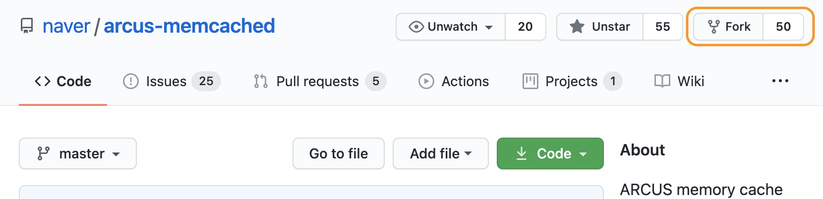 원본 프로젝트의 저장소를 들어가보면 오른쪽 상단에 Fork 버튼을 선택하여 내 github 저장소에 복사할 수 있다.