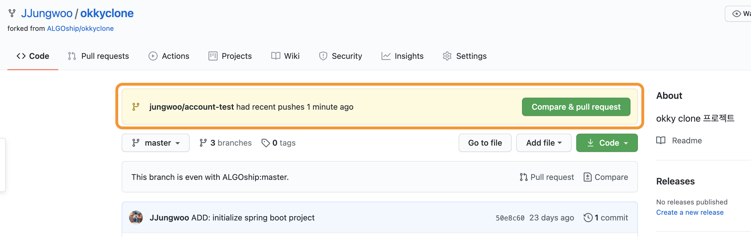 그러면 이제 compare & pull request 버튼을 눌러 원본 프로젝트에 pr 요청을 할 수 있다.