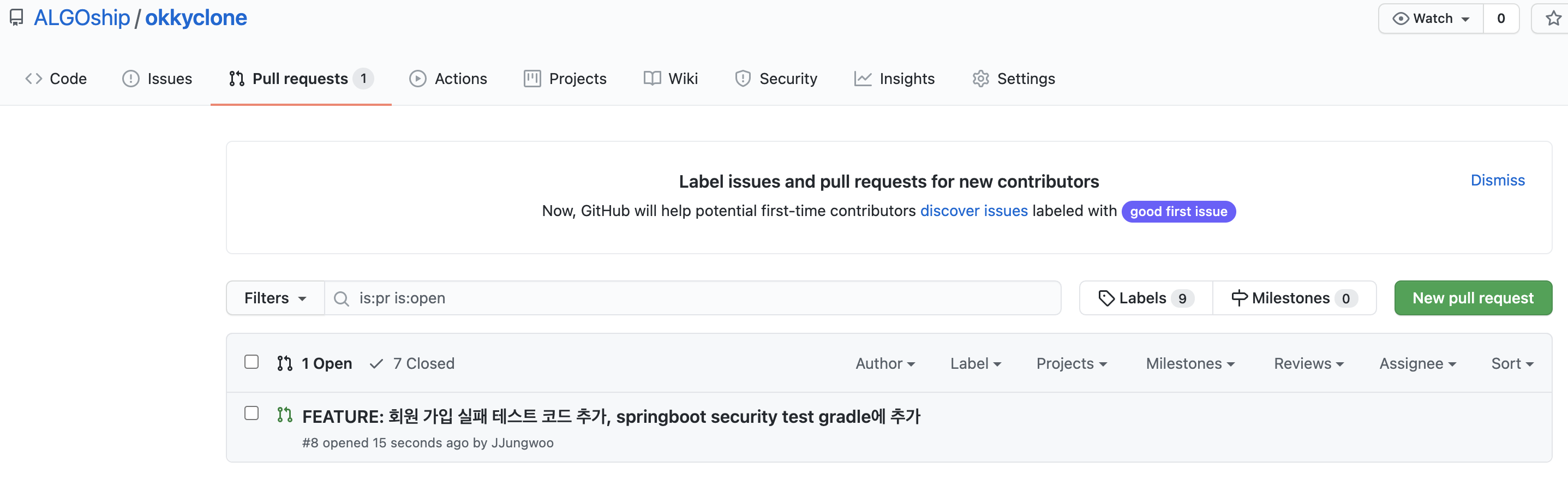 pr 메시지 작성과 merge할 branch를 선택한 뒤에 Create pull request를 눌러 pr을 생성하면 아래와 같이 pr 이 만들어진 것을 확인할 수 있다. 🥳